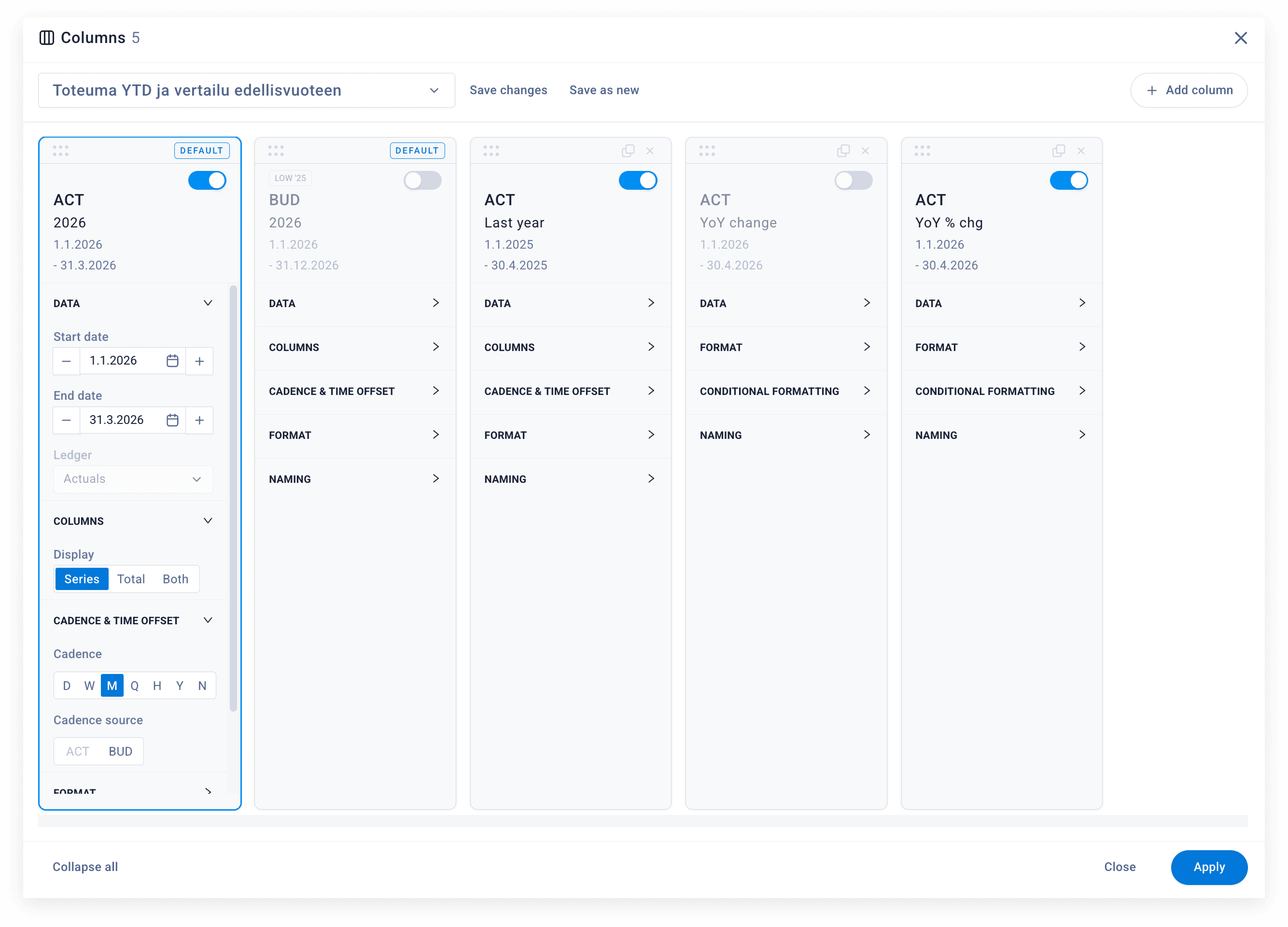Display toggle (Series, Total, Both) now available on default ACT and BUD columns; new cadence option None aggregates all values into a single column