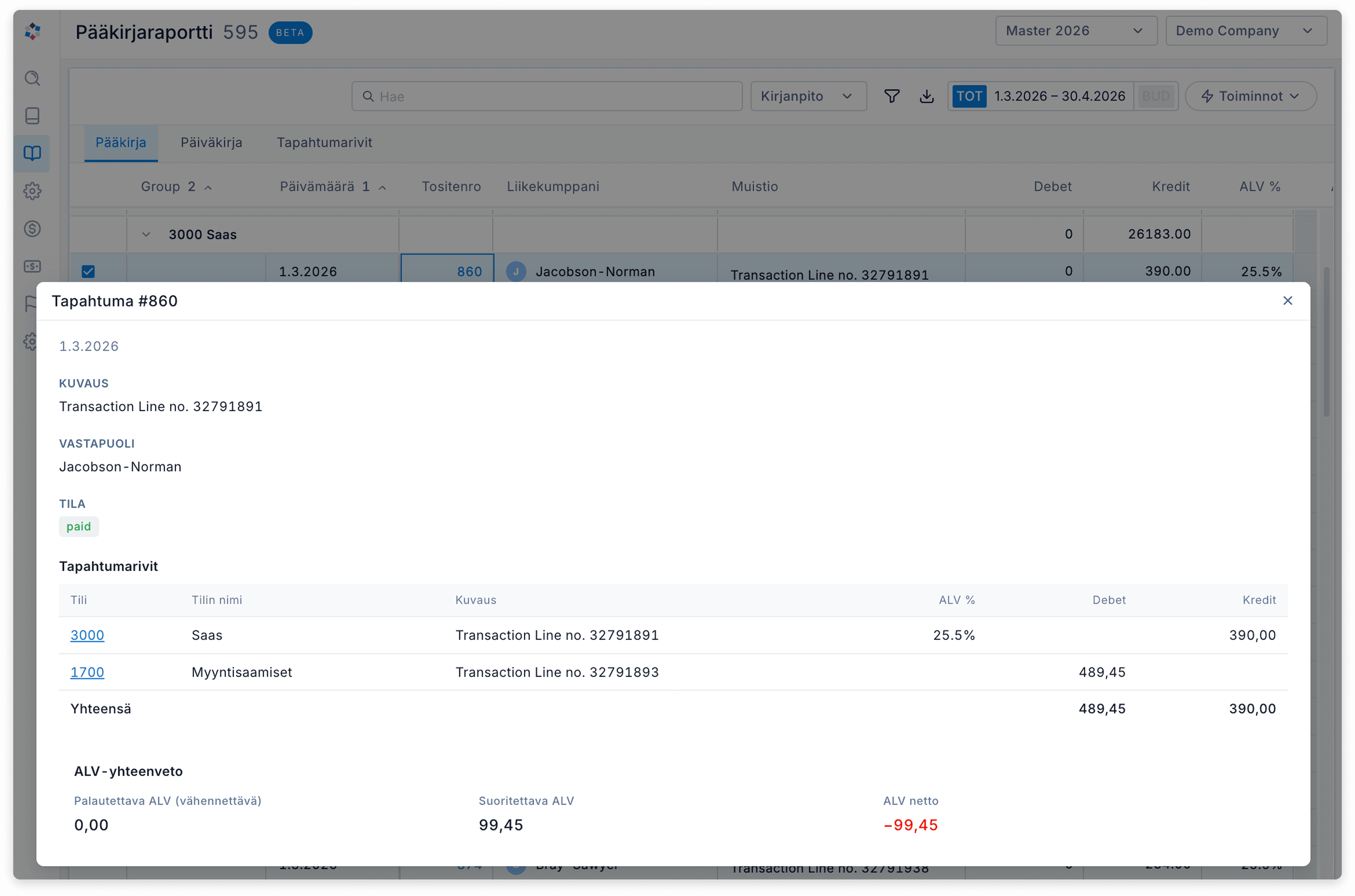 Full search and filtering across all fields, including memo text, counterparty, invoice number, VAT codes, and dimensions